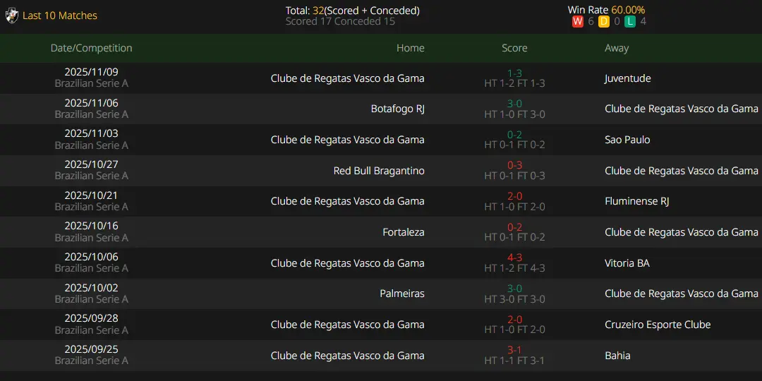 Vasco da Gama has the best away record in the second half of the Campeonato Brasileiro Série A season (4 wins, 1 draw, 2 losses, 62% win rate). They have kept clean sheets in 3 of their last 7 away matches (43%), making them the best away defensive team during the same period. During this time, they scored 1 goal every 4.4 shots, with impressive offensive efficiency. They previously suffered a 3-match losing streak mainly because Vasco da Gama has basically confirmed some players who will leave next season, made trade-offs in the squad, and inevitably experienced a difficult period due to injuries.