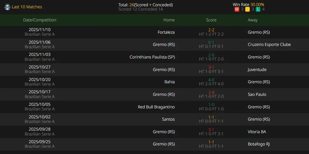 Grêmio has either drawn or lost their last 3 matches, currently only 5 points above the relegation zone. They not only have to worry about points but also deal with off-field troubles. The club was hit with a transfer ban on Tuesday, barring them from registering players in the next three transfer windows. FIFA announced the penalty, which took effect on the 18th and will remain in place until Grêmio settles its debts. Later, Grêmio officially stated that the measure will not have a "practical impact" and they will pay the relevant fees in the next few days to lift the ban. The ban does not affect player contract renewals—veteran Ednilson chose to renew his contract with Grêmio until December next year. Ednilson has contributed 5 goals and 7 assists this season (the team’s top assist provider) and has started 11 consecutive matches recently. As an advanced player in the three-man midfield, he plays a crucial role in the attack, but he will be sidelined due to suspension in this round. Noriega, William and Aravena are unavailable due to injuries.