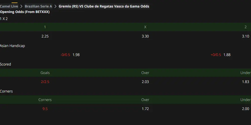 Grêmio finished 14th last season, and with few rounds left in this season’s league, they are likely to rank in the middle and lower reaches for two consecutive years. Specifically for this round of Campeonato Brasileiro Série A, the absence of several players led by Ednilson will have a real "practical impact" on Grêmio’s tactical arrangements. In terms of Asian Handicap, the initial line opened with Grêmio as -0.25 favorites and has remained stable since then. Considering Grêmio’s current situation, Vasco da Gama has a good chance of getting points at Grêmio’s home ground. Both teams are mid-to-lower tier teams, so there won’t be much difference in their basic strength.