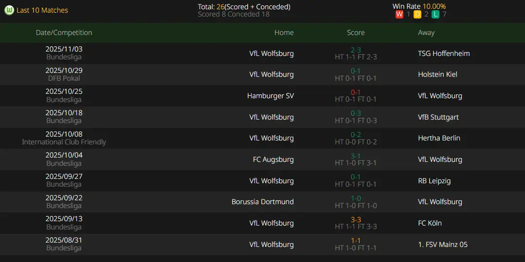 VfL Wolfsburg’s overall form has been extremely sluggish, losing 5 out of their last 6 league matches. The team is facing serious problems at both attack and defense: the offense has scored only 4 goals in 6 games (0.67 goals per game on average); the defense has conceded a whopping 11 goals in these 6 matches, with an average of 1.83 goals conceded per game. However, the team is not without fighting chance away from home, having secured 2 league victories on the road this season. Goalkeeper Koen Casteels has maintained a good save success rate, being a bright spot in the defense. Amid poor form and an away fixture, Wolfsburg is likely to adopt a relatively pragmatic counterattacking strategy. The team will rely on Casteels’ performances to stabilize the defense and look for limited counterattack opportunities.