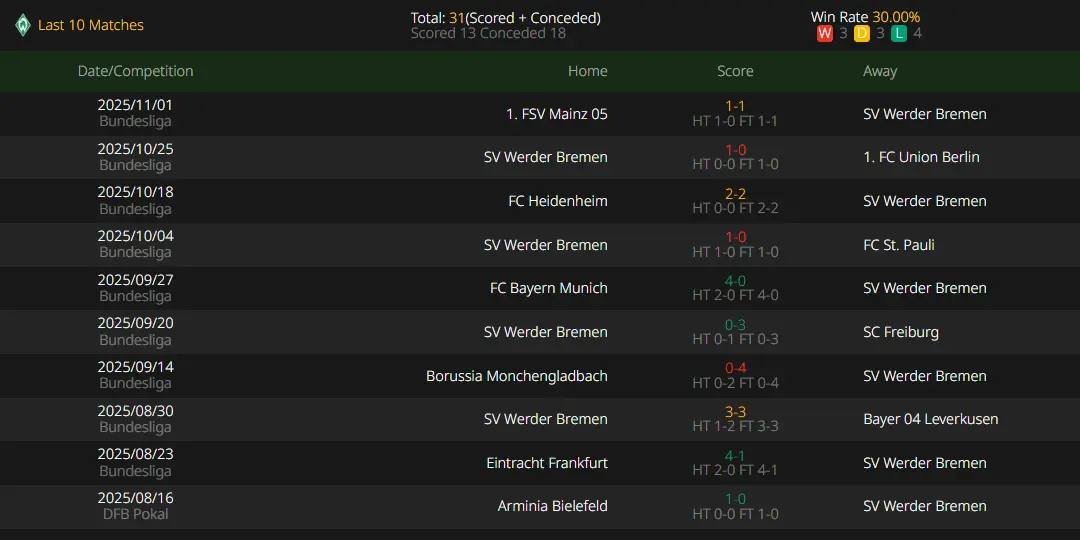 Werder Bremen’s form has improved significantly recently, remaining unbeaten in 4 consecutive league matches (2 wins, 2 draws). The team has performed particularly positively at home, securing two consecutive home victories and demonstrating solid competitiveness. Notable improvements have been seen at both ends of the pitch: they have scored in 4 consecutive league games on the offensive front; defensively, they have conceded an average of only 0.75 goals per game in the last 4 matches. Additionally, the team is very good at holding on to leads this season, winning 100% of their matches where they took the lead. They will adopt a more proactive attacking stance relying on home advantage, striving to score early to take control of the game rhythm—given their proficiency in winning when leading.