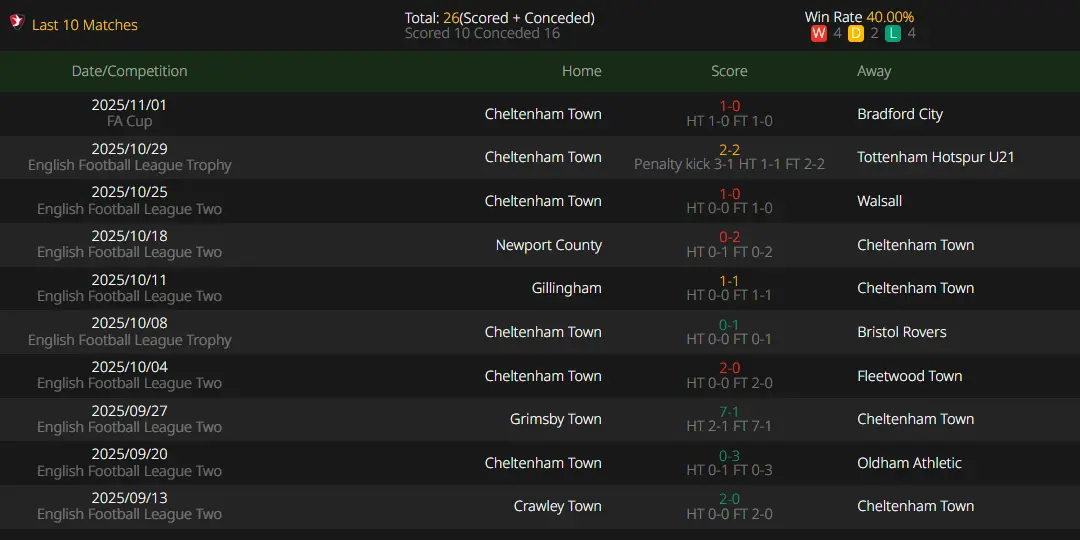 Cheltenham Town started their second consecutive EFL League Two campaign with a poor run of five consecutive defeats. With the team’s form failing to improve, the club parted ways with former manager Michael Flynn in September, appointing Wade Elliott as his replacement. Under Elliott’s leadership, Cheltenham have achieved 3 wins and 1 draw in the league, returning to winning ways and escaping the relegation zone—an immediate impact from the managerial change. They advanced to the second round of the FA Cup by defeating a League One team in their last match, boosting team morale significantly. Defender Sean Long also made a comeback from injury in that game, leaving Cheltenham with almost no injury concerns.