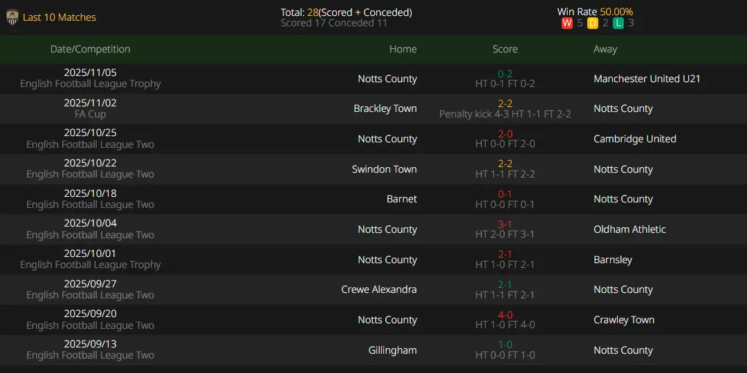 Notts County narrowly missed out on promotion to League One last season and remain a strong side this year. After 14 games, they have collected 24 points to sit 8th in the standings, just 5 points behind leaders Walsall with one game in hand. While their league form is impressive, Notts County have struggled in cup competitions, being eliminated from both the FA Cup and EFL Trophy recently, indicating a slight dip in form. Notably, they excel at home but struggle away from home, securing only two narrow wins in 7 league away games this season. In terms of personnel, defender Aden Baldwin is sidelined due to injury, but there is good news as Ruben Rodrigues has recovered from injury and is expected to start.