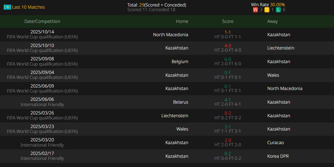 Kazakhstan currently ranks 4th in Group J. With only one game left, the team has lost the chance to qualify for the World Cup. However, although its strength is inferior to Belgium's in this match, it has the potential to cause an upset. Previously, its domestic club Kairat eliminated Champions League winner Celtic on penalties, demonstrating tenacious defensive resilience and penalty shootout capabilities. Playing at home, Kazakhstan has geographical and atmospheric advantages; it will most likely adopt a compact defensive tactic, relying on the cheering of home fans to look for counter-attack opportunities and attempt to replicate the club's upset miracle.