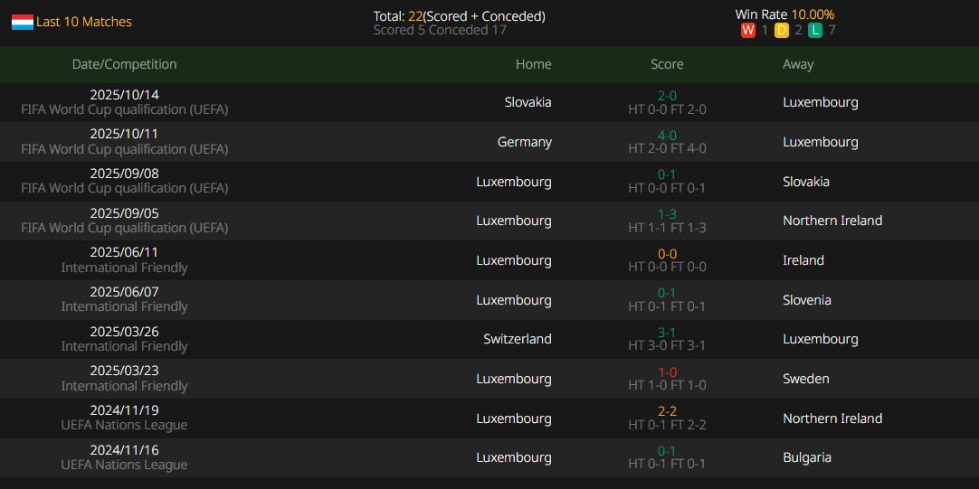 Luxembourg is currently ranked 97th in the world and 40th in Europe. Globally, it stands at a mid-tier level in football, but in Europe where strong teams abound, it can only be categorized as a third-tier side. The team changed its head coach before the World Cup qualifiers, with local manager Dan Strasser taking office. However, the team has failed to secure a single point in four qualifiers so far. Its current goal is simple: to get at least one point in the last two games to avoid finishing with zero points. Having lost all four matches, Luxembourg has been eliminated in advance. Nevertheless, playing at home, the team will not take the game lightly even after elimination. In their last away match against Slovakia, Luxembourg did have chances, launching multiple shots but with mediocre quality. In terms of personnel, Luxembourg's all-time top scorer Gerson Rodrigues is banned from the national team due to domestic violence and repeated assaults. Key center-back Maxime Mermoz is also unavailable for this match due to physical discomfort, and his absence further weakens the already fragile defense and midfield. Luxembourg has suffered heavy defeats in both previous encounters with Germany. Although playing at home this time, the team's motivation and confidence are severely undermined by early elimination, and avoiding a thrashing is its primary goal for this match.