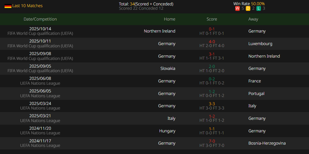 Germany is a European powerhouse, having won the World Cup four times, and its strength is obvious to all. The team boasts a luxurious squad. Young star Robert Waltermad is included in the squad again this time—he scored the winning goal against Northern Ireland to help the team secure victory. Midfielder Florian Wirtz anchors the midfield. After joining Liverpool this season, Wirtz has struggled to adapt: he has not scored or provided any assists in 11 Premier League games so far, which has inevitably disappointed fans. Although Germany currently tops the group, it has the same points as Slovakia behind it, so the prospect of direct qualification is not very clear. The team's goal is to win to consolidate its top position, and the last match will be crucial for whether it can qualify directly. In terms of the squad, Germany cannot field its strongest lineup: Leroy Sané has returned to the squad, but Joshua Kimmich is definitely out due to a right ankle capsule injury. In addition, midfielder Nadiem Amiri was omitted due to injury, and center-back Nico Schlotterbeck is also sidelined with an injury. Overall, Germany's squad is not complete, but it is more than sufficient to face Luxembourg, a third-tier European team.