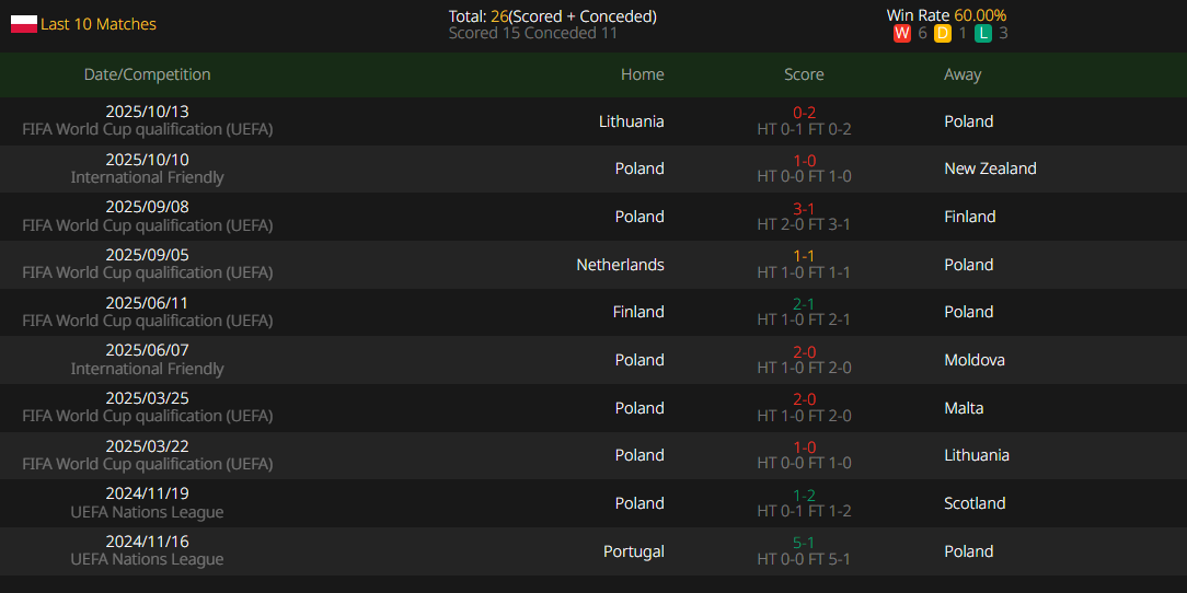 Poland's paper strength has never been among the first-tier in Europe, but its performance this year has been quite impressive, losing only one game in eight matches. The team's tactical core is built around "tenacious defense + efficient counter-attacks". The sweeping ability of the double defensive midfielders forms a solid barrier, and the center-back partnership defuses threats with excellent positioning and confrontation abilities. Recently, the home defense has remained highly stable. In attack, the team does not linger on possession; it is good at launching lightning counter-attacks through precise long passes. The combination of rapid wing advances and central raids is highly lethal, and set-piece tactics have become increasingly polished, serving as a key weapon to break down compact defenses. However, the team's ball control ability is relatively weak, and midfield distribution may occasionally fluctuate when facing high-pressure pressing.