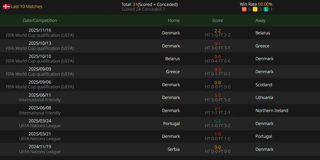 Denmark is currently ranked 20th in the world. In the World Cup European Qualifiers, after 5 matches, they have maintained an unbeaten record of 3 wins and 2 draws, topping Group C with 11 points. Denmark has been in stable form recently, remaining unbeaten in 7 consecutive matches. In their last match against Belarus, they had 67% possession, 35 shots (10 on target)—five times that of their opponents. Mikkel Damsgaard and Kasper Dolberg scored for the team, eventually drawing 2-2.