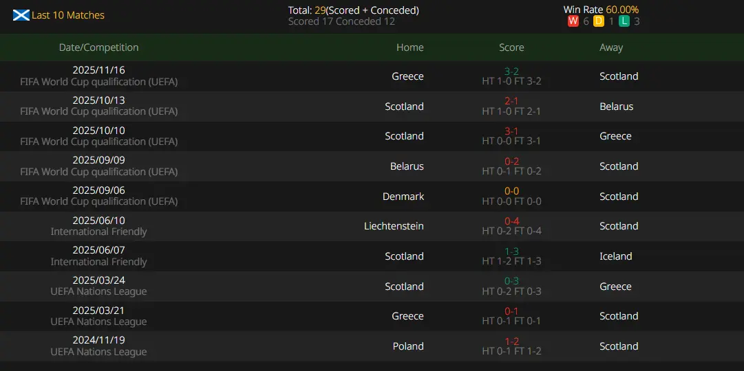 Scotland is currently ranked 38th in the world. In the World Cup European Qualifiers, after 5 matches, they have achieved 3 wins, 1 draw and 1 loss, accumulating 10 points to rank second in Group C, only 1 point behind their opponents in this match. Scotland’s recent form has declined, with the team losing 2-3 to Greece in their last match. In terms of the squad, Ross McCrorie, Billy Gilmour and Lennon Miller are injured and are likely to miss the game.