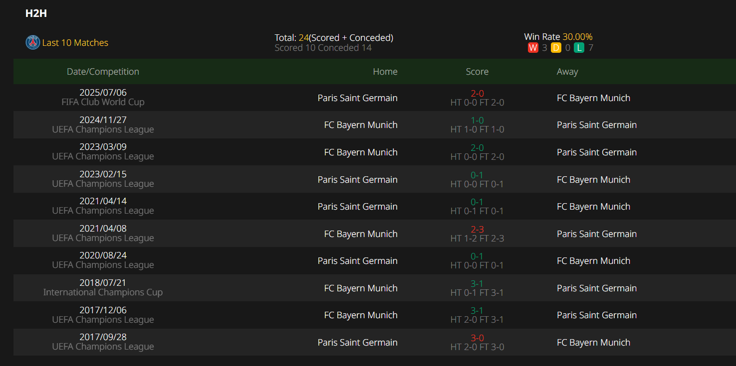 - History & Redemption: Bayern holds the upper hand with 8 wins in 14 Champions League meetings, including four consecutive victories, but PSG claimed bragging rights with a 2-0 win in this summer’s Club World Cup – adding extra spice to their rivalry.