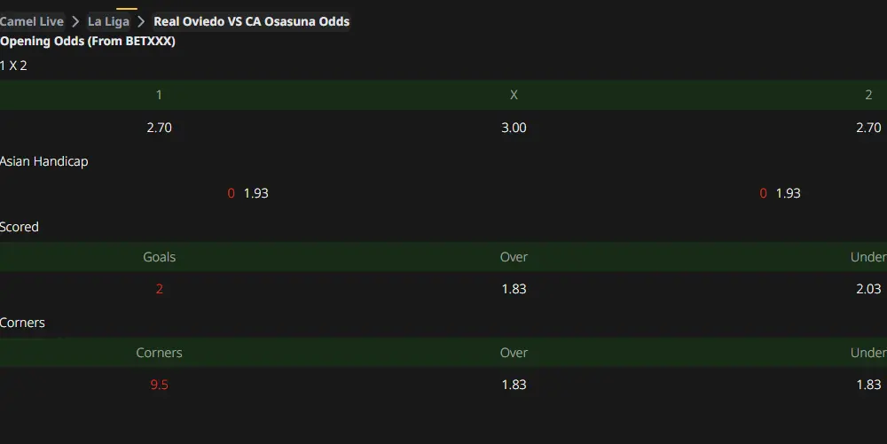 In the past 6 head-to-head encounters with Osasuna, Real Oviedo has achieved 2 wins, 1 draw and 3 losses—slightly at a disadvantage. The Asian Handicap initially opened with a level handicap for this game, and the current line remains stable. As a promoted side, Real Oviedo has relatively weak strength, while Osasuna has lost all their away games this season and has no decent reputation when playing away.
