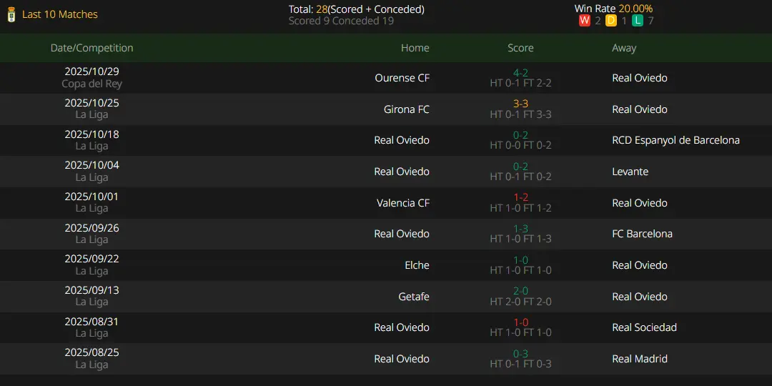 As a promoted side, Real Oviedo’s success this season in La Liga will be to avoid relegation. Their squad strength is indeed quite average, and they do not have much competitiveness in the top league. The team made a coaching change last month, with Jagoba Arrasate returning for a second spell as Real Oviedo’s manager. Currently, the team ranks 18th (second from the bottom) in the league. As the team with the lowest market value in La Liga, their strength basically corresponds to their ranking. Oviedo still has to rely on veteran Salomón Rondón in the frontcourt, while the individual strength of other players is indeed not impressive. Avoiding relegation is indeed a great challenge for them.