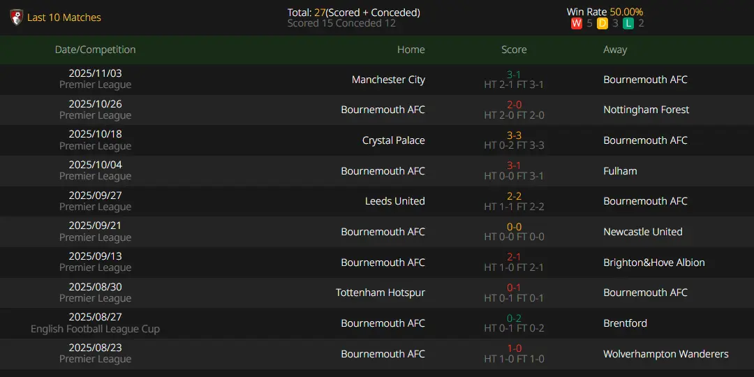 Bournemouth is a dark horse this season, once climbing to the second place in the standings. Currently, with 5 wins, 3 draws and 2 losses, accumulating 18 points, they rank 7th with one game in hand. Through signings and sales during the offseason, the team has upgraded and replaced the entire lineup, ushering in a small outbreak. Their league positioning has directly changed from a mid-to-lower relegation team to a mid-to-strong team, basically on the same level as Villa. The team lost 1-3 to Manchester City in the last round, ending their previous 7-game unbeaten streak, which may have dealt a certain blow to their morale. However, it is certain that Bournemouth is a very impressive dark horse team this season with strong competitiveness. Challenging Aston Villa away this time, the team is bound to cause enough trouble for the opponent.