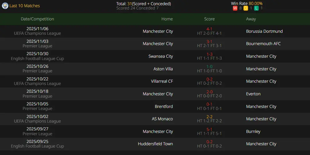 Manchester City has performed steadily in the league this season. After 10 rounds, they have 6 wins, 1 draw and 3 losses, accumulating 19 points and ranking 3rd. Their home performance shows strong competitiveness—with 4 wins and 1 loss in 5 home games, a winning rate as high as 80%, and impressive offensive and defensive data of 13 goals scored and 4 conceded. The team's recent form has rebounded strongly. After defeating Bournemouth 3-1 at home in the last Premier League round, they thrashed Borussia Dortmund 4-1 in the midweek Champions League, winning two consecutive games. The team's home performance is extremely dominant with a high winning rate in the league this season. Their core striker Haaland is in outstanding form, having scored 13 goals in the Premier League this season and leading the scoring chart.