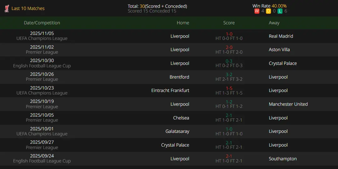 Liverpool ranks 6th in the league this season with 6 wins and 4 losses, accumulating 18 points. Their overall record is comparable to Manchester City, but their form is obviously fluctuating—only 4 wins and 6 losses in the last 10 games across all competitions. The team's away performance is mediocre, with 2 wins and 3 losses in 5 away games. The problem of offensive and defensive imbalance is prominent, and the away data of 8 goals scored and 9 conceded is hardly stable. Fortunately, the team's recent form has rebounded. They defeated Aston Villa 2-0 at home in the last Premier League round, ending their 4-game losing streak in the league, and defeated Real Madrid 1-0 in the midweek Champions League.
