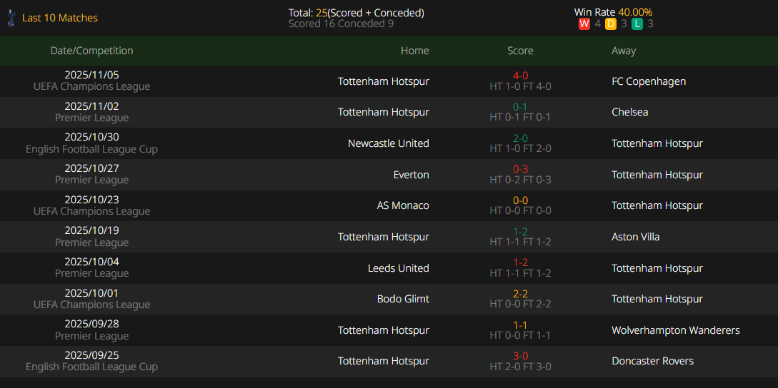 Tottenham currently ranks 6th in the Premier League, just 1 point away from the Champions League qualification zone. The team showed great attacking desire in their last Champions League home game, thrashing Copenhagen 4-0. However, their performance in the domestic league has been inconsistent, with results failing to sustain. Despite fluent frontcourt cooperation and numerous scoring opportunities created, defensive issues remain prominent, with a high number of goals conceded. At home, the team has not shown a strong aura recently, going through an winless streak of 1 draw and 2 losses.