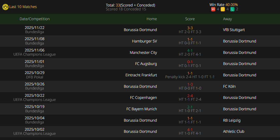 Borussia Dortmund has a solid record against La Liga teams at home, achieving 9 wins, 5 draws, and 6 losses in their last 20 home matches. They have also performed steadily in the Champions League group stage this season, defeating Athletic Bilbao 4-1 at home in their opening match and demonstrating strong attacking power. In the Bundesliga last weekend, Dortmund drew 3-3 with Stuttgart at home, suffering a two-match draw streak. They currently rank 4th in the Bundesliga standings, 3 points behind 2nd-placed RB Leipzig. Nevertheless, their home performance remains reliable—with 3 wins and 2 draws this season, they are unbeaten at home. However, Dortmund has drawn two of their last three home games, indicating that their offensive efficiency urgently needs improvement.