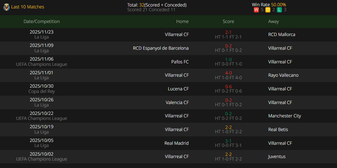 Villarreal defeated Mallorca 2-1 in La Liga last weekend, securing a two-match winning streak. They currently rank 3rd in the La Liga standings, only 3 points behind leaders Real Madrid. The team is in excellent form recently, winning 4 of their last 5 matches. Despite a poor start to the Champions League (1 draw and 3 losses in 4 games), their strong performance in the league has boosted team confidence. Villarreal also has a good record against Bundesliga teams, with 6 wins, 5 draws, and 3 losses in 14 previous encounters, and they have remained unbeaten in their last 6 matches (2 wins and 4 draws).