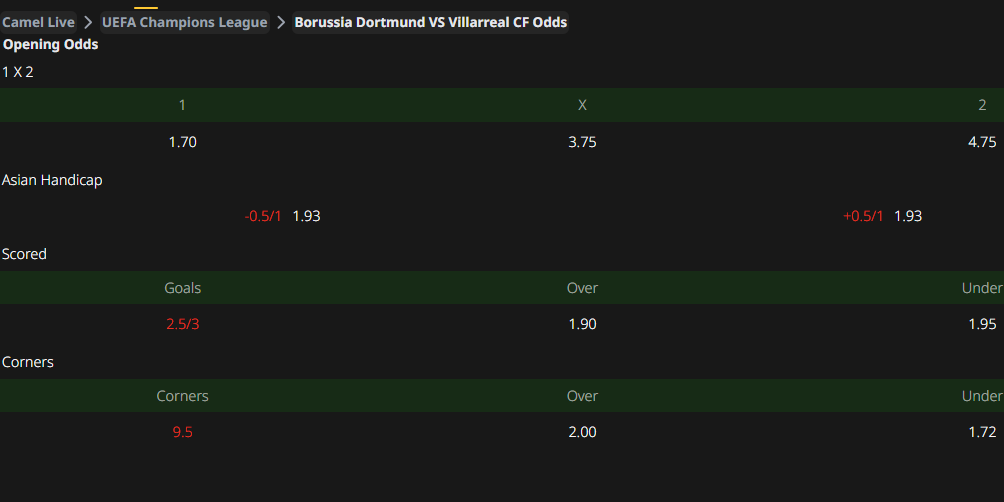 UEFA Champions League : Borussia Dortmund vs Villarreal Prediction & Betting Tips