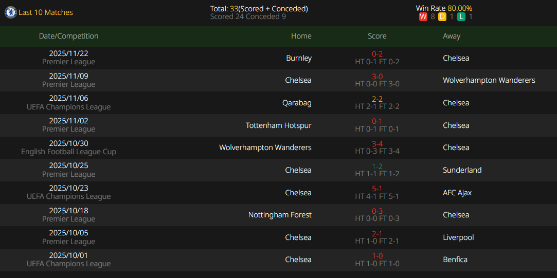 Chelsea has a record of 2 wins, 1 draw, and 1 loss in the Champions League. According to Champions League rules and historical data, the Blues need at least 3-4 more points to secure a play-off spot, and a minimum of 6-7 points to compete for a direct top-8 qualification. Their remaining fixtures include home matches against Barcelona and Pafos, and away matches against Atalanta and Napoli. In the first 4 Champions League games, Chelsea lost 1-3 to Bayern Munich away, defeated Benfica 1-0 at home, thrashed Ajax 5-1 at home, and drew 2-2 with Qarabağ away. Under manager Enzo Maresca, Chelsea has scored an average of 2.25 goals per game in the Champions League but conceded 1.5 goals per game—while their home performance is strong, overall stability is lacking. Outside the Champions League, Chelsea has achieved 6 wins and 1 loss in their last 7 games across all competitions, including a 2-1 home win over defending champions Liverpool on October 5th. With a 2-0 away win over Burnley last round, Chelsea has secured a three-match winning streak in the Premier League, earning 15 points in their last 6 games and closely chasing league leaders Arsenal.