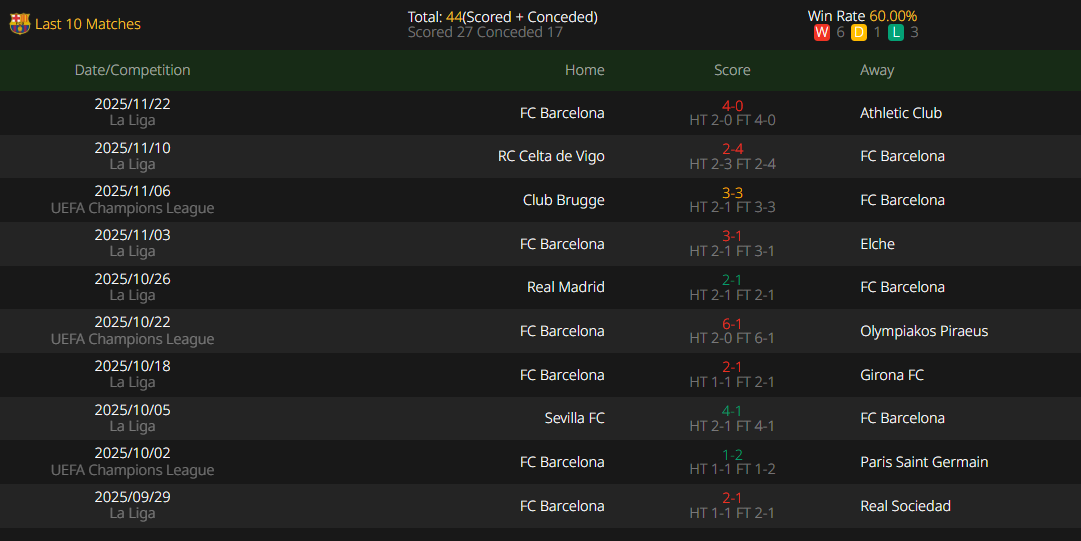 Barcelona also has 7 points from 2 wins, 1 draw, and 1 loss in the Champions League. Their first 4 games saw them defeat Newcastle United 2-1 away, lose 1-2 to Paris Saint-Germain at home, thrash Olympiacos 6-1 at home, and draw 3-3 with Club Brugge away. Scoring an average of 3 goals per game in the Champions League, their attacking firepower (67 goals in 24 consecutive Champions League matches) has become their trademark. Barcelona’s final 4 Champions League fixtures include matches against Chelsea, Eintracht Frankfurt, Slavia Prague, and Copenhagen—with only the game against Chelsea being relatively difficult. After a wave of injuries in October, a good result in this match will be beneficial to the team’s subsequent ranking. Barcelona defeated Athletic Bilbao 4-0 last round, and more importantly, key players have gradually returned from injuries. With Raphinha coming off the bench last round, Barcelona’s attack has regained its strongest lineup featuring Robert Lewandowski, Raphinha, Dani Olmo, Ferran Torres, Lamine Yamal, and Frenkie de Jong.