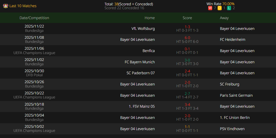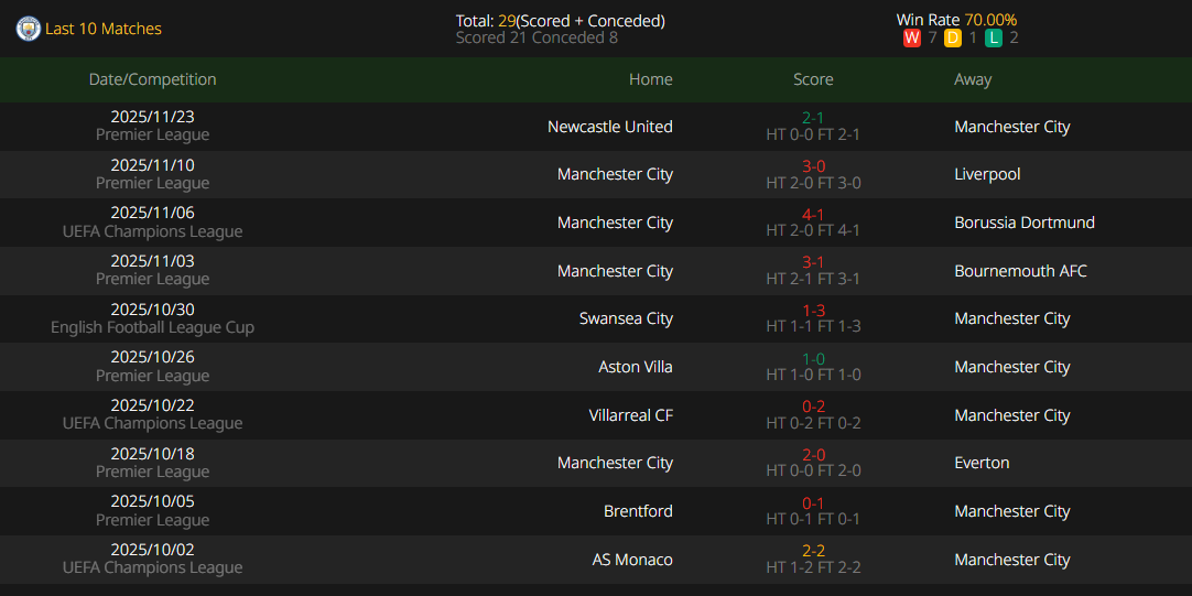 Bayer Leverkusen has achieved remarkable results after a coaching change early in the season. Following their weekend win over Wolfsburg, they climbed to 2nd place in the Bundesliga, trailing only Bayern Munich, and are in good form. They will undoubtedly launch a strong challenge against Manchester City away in the Champions League with high motivation. However, Leverkusen faces injury and suspension issues: key left-back Grimaldo is injured, defensive midfielder Andrich is suspended due to a red card, and Lucas Vázquez, Ezequiel Fernández, and Axel Tappe will also be absent. Leverkusen has shown stable form in the Bundesliga recently, with 5 wins and 1 loss in their last 6 games (over 80% win rate), scoring 17 goals (nearly 3 per game) in those 6 league matches and 6 goals in 4 Champions League games. They had a slow start to the Champions League, with 1 win, 2 draws, and 1 loss in 4 games, ranking 21st. Their recent away form has been inconsistent—2 wins and 2 losses in their last 4 away games, with a 50% win rate in 10 away matches, so their away capabilities still need improvement.