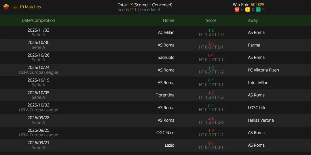 Although Roma holds an advantage in strength, they also face multiple tests. The team currently has 3 points from 1 win and 2 losses in 3 Europa League matches, with a 50% winning rate (3 wins and 3 losses in their last 6 matches). They are only 1 point away from the play-off qualification zone, and an away win will lift them out of the awkward position on the edge of the relegation zone. As a strong Serie A team, Roma’s squad value is more than three times that of Rangers, with richer European competition experience (3 Serie A titles, 1 UEFA Europa Conference League title). The team will stick to the familiar 3-4-2-1 formation: goalkeeper Mile Svilar has a 90.9% save rate to secure the defense, center-backs Gianluca Mancini (No. 23) and Evan Ndicka form the core, right-back Zeki Çelik is the defensive pillar with 5.8 average clearances per game, and the double midfield pivot of Bryan Cristante and Ebrima Koné focuses on interception and rhythm control. Captain Lorenzo Pellegrini (No. 7) is the offensive core—contributing 1 assist in 2 Europa League matches this season and accumulating 11 goals and 13 assists in his Europa League career. He will form a threat with winger Soule (No. 18), whose 4 recent shots on target rank first in the team, and Artem Dovbyk will play as the lone striker in the frontline. However, Roma’s injury problems are more severe: 8 players are sidelined, including Paulo Dybala (muscle injury), Leon Bailey (muscle strain), and Evan Ferguson, seriously damaging the team’s offensive creativity. Additionally, they need to face Serie A opponent Udinese in 3 days, and the dense fixture schedule may affect the team’s rotation strategy and physical fitness reserves.