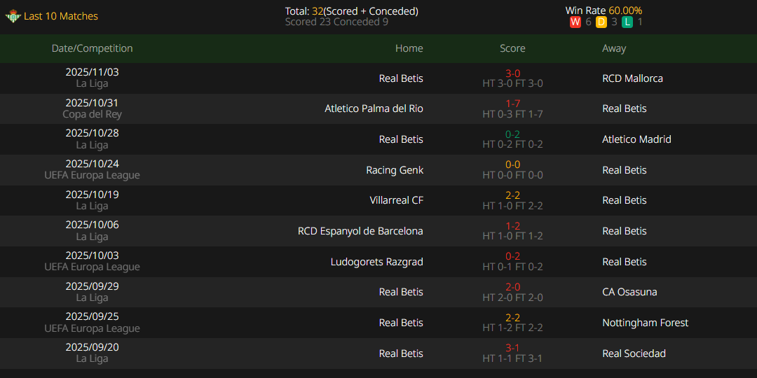 Real Betis has recently enjoyed a home resurgence. In their last La Liga home match, they swept Mallorca 3-0—winger Anthony scored twice and provided one assist, and his "right-sided connection" with right-back Héctor Bellerín created all the threats for the three goals. With this victory, Betis has secured three consecutive home wins and delivered a solid record of 4 wins, 1 draw and 2 losses in their last seven home matches. The passionate atmosphere at the Estadio Olímpico de Sevilla has become the team’s strongest backing. However, the team also faces obvious hidden dangers: key midfielder Sergio Canales is troubled by a waist injury, leading to a significant decline in passing accuracy. Meanwhile, the absences of defender Junior Firpo (muscle contusion) and midfielder Isco (long-term absence due to a leg fracture) will test the depth of the team’s midfield and defensive rotations.