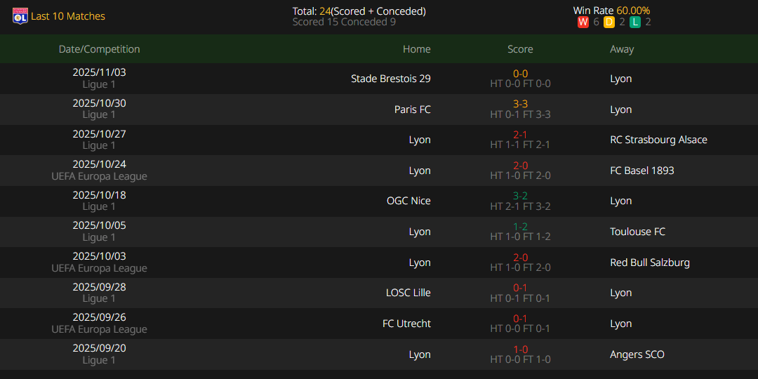 Lyon has shown a trait of "specializing in the Europa League"—remaining undefeated in the competition so far this season, including a convincing 4-0 victory over Steaua București in the last round that showcased their offensive firepower. In the league, the team’s form has recently rebounded, achieving 4 wins and 2 losses in their last six matches. Their victory over Strasbourg last weekend ended a two-game losing streak, and they currently sit firmly in fourth place in Ligue 1 with 18 points. However, Lyon’s away defense has obvious loopholes—conceding three goals in two of their last three away matches. Additionally, the absences of key players such as forward Fofana (ankle sprain), midfielder Mangala (knee injury), and defender Abner (suspension) have created noticeable gaps at both ends of the pitch.