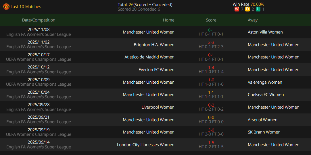 Manchester United Women have made a strong start in European competition this season, securing two consecutive wins and entering a positive phase of form. Their defense has been impressive, with no goals conceded in the group stage so far. However, a recent 1-0 home defeat to Aston Villa Women in the domestic league exposed occasional imbalances in their home attack and defense rhythm. The forward line is led by Norwegian striker Elisabeth Terland, who scored a hat-trick to help the team progress in European competition. Manchester United hold home advantage but face injury and suspension issues: defender Millie Turner and winger Celin Bizet are sidelined with injuries, while key player Dominique Janssen is suspended. Tactically, they are expected to leverage home advantage with a relatively cautious and organized approach, prioritizing solid defense and creating chances through midfield possession and wide advances. Their attack may not be overly aggressive; instead, they will attempt to score through structured build-up play and set-pieces. Given the opponent’s poor form, Manchester United are likely to focus on building a solid defense in their own half, combining defense with counter-attacks.